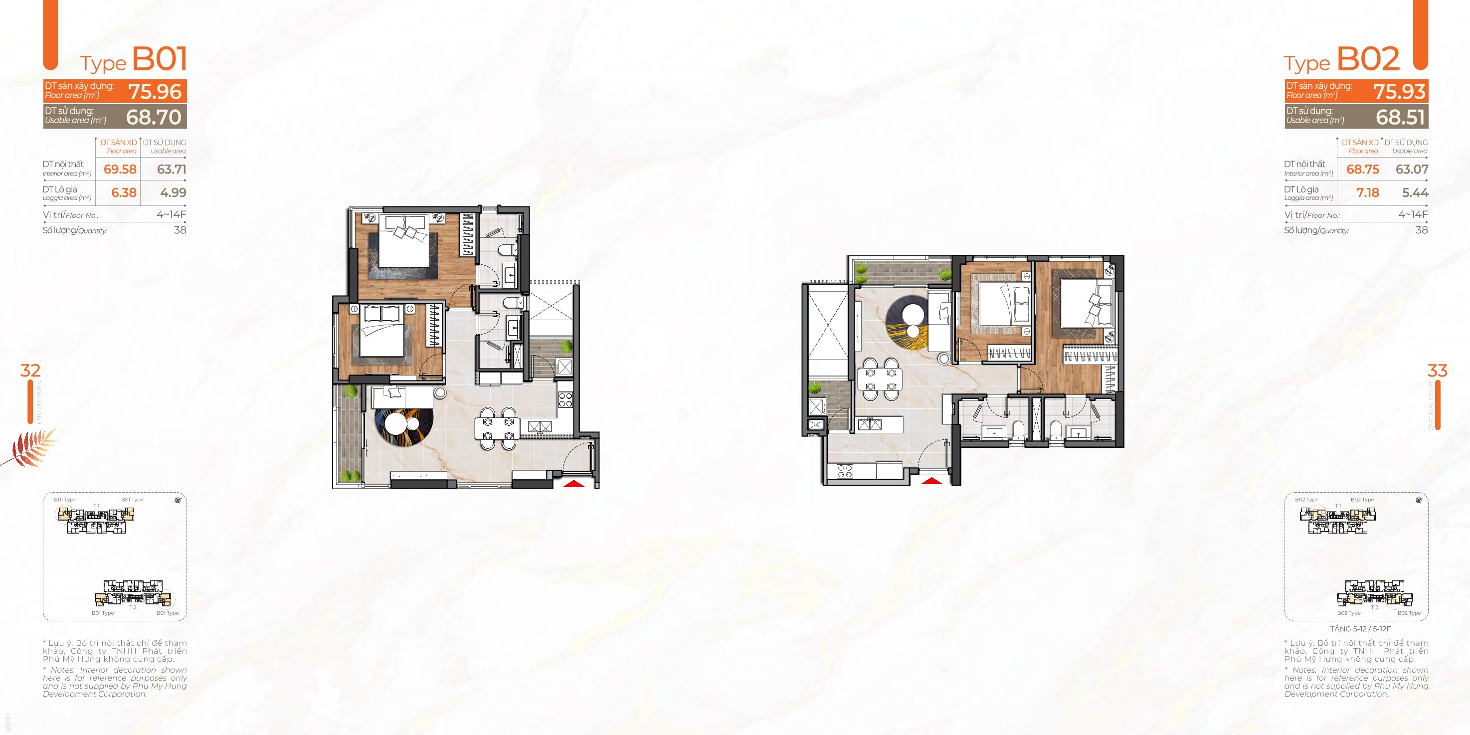 - 2 Phòng ngủ: 128 căn, diện tích từ 75,93m² – 76,12m².