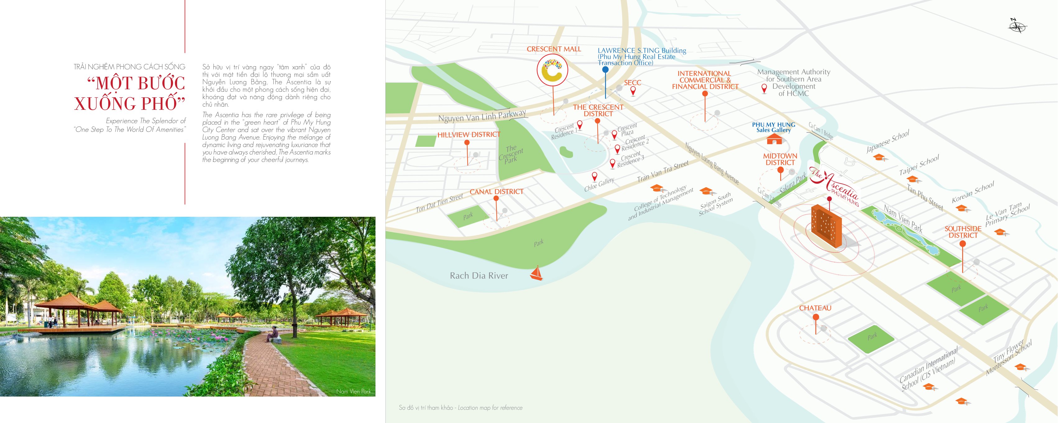 Vị trí của The Ascentia còn là giao điểm của 3 phân khu quan trọng: Khu Thương mại Tài chính Quốc tế, Khu Phức hợp Midtown và Khu dân cư Nam Viên. Đồng thời, dự án là cầu nối trực tiếp hai địa danh thanh thế bậc nhất Phú Mỹ Hưng: Khu biệt thự lâu đài Chateau và Khu phức hợp Midtown – nơi có công viên hoa anh đào Sakura Park.