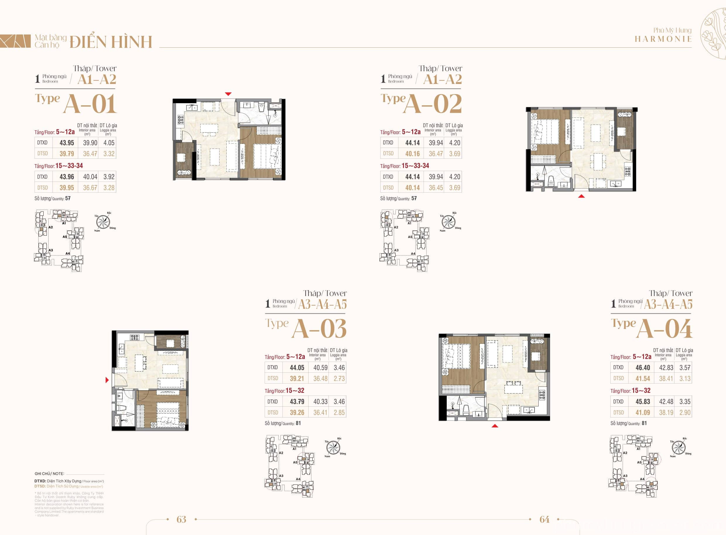 | Loại hình | 276 Căn hộ 1 phòng ngủ: 43.79 – 46.4 m2