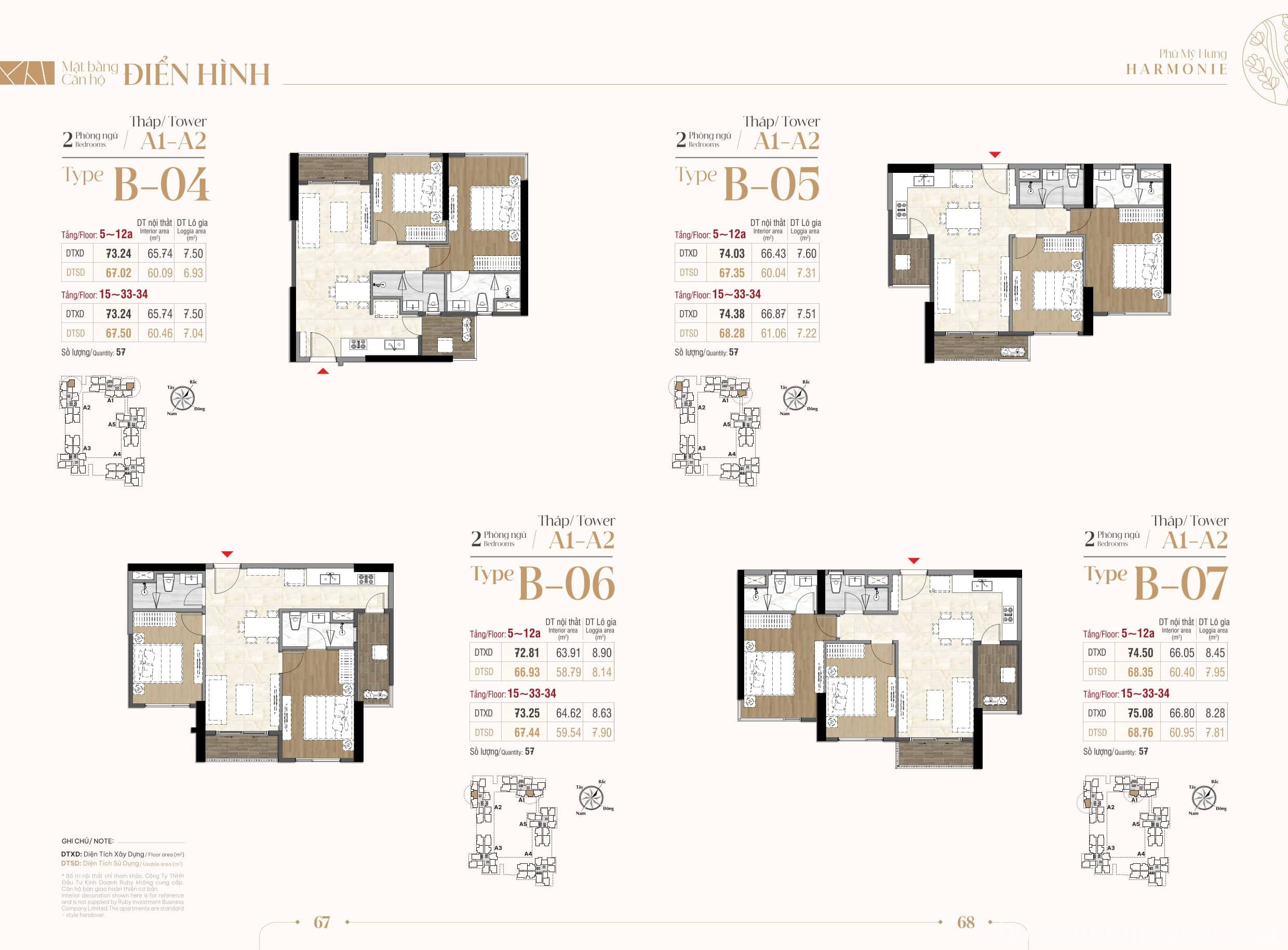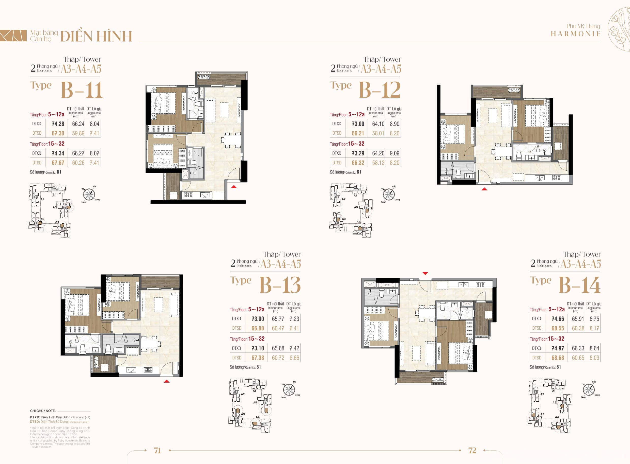 - Căn hộ 2 phòng ngủ (Diện tích từ 72.37 – 79.47 m²): Là dòng sản phẩm chiếm số lượng lớn nhất (khoảng 1.047 căn), được bố trí khoa học giữa phòng khách và các phòng ngủ, lý tưởng cho gia đình trẻ,,,.