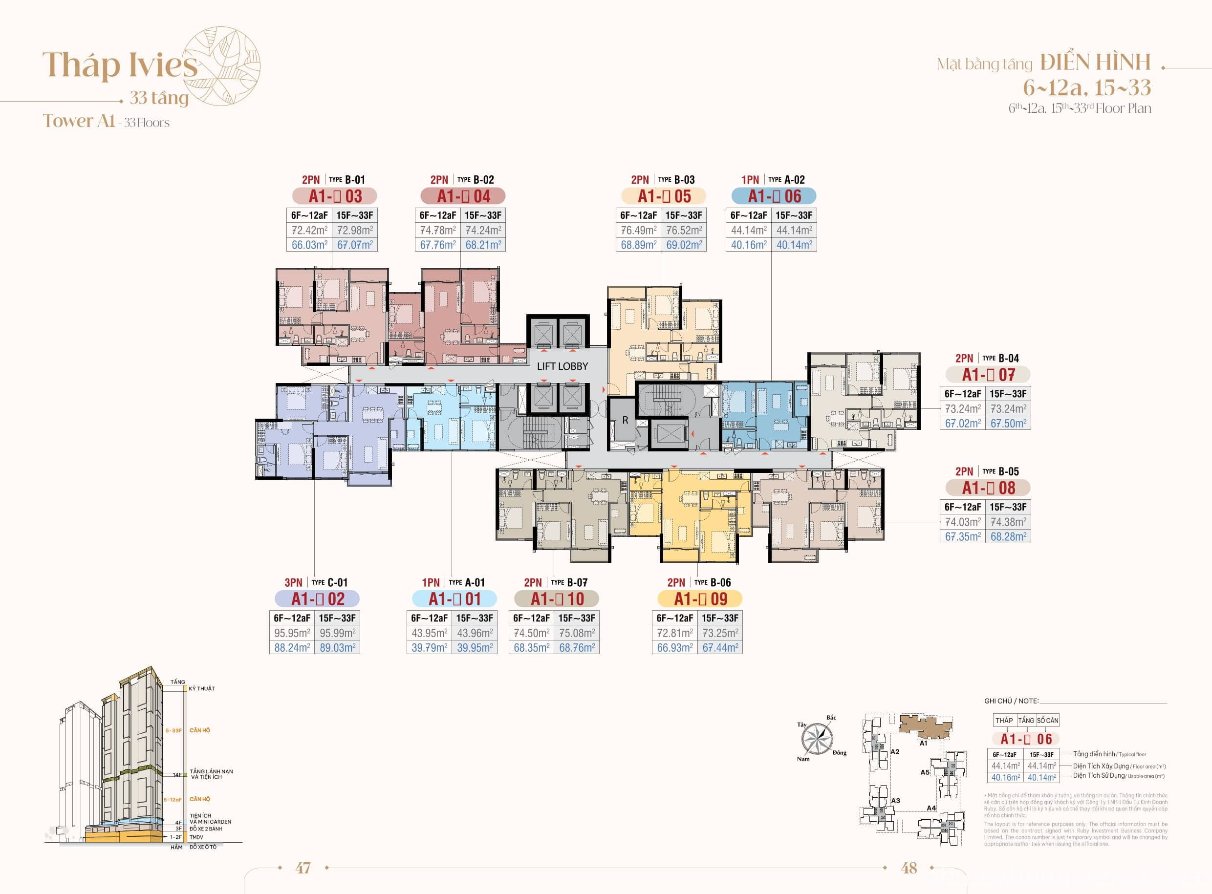 1047 Căn hộ 2 phòng ngủ: 72.37 – 79.47 m2 136 Căn hộ 3 phòng ngủ: 93.73 – 95.99 m2 23 Căn hộ Shophouse + 1 Nhà Trẻ 3 Căn Ground House: 149.36 – 168.7 m2 |