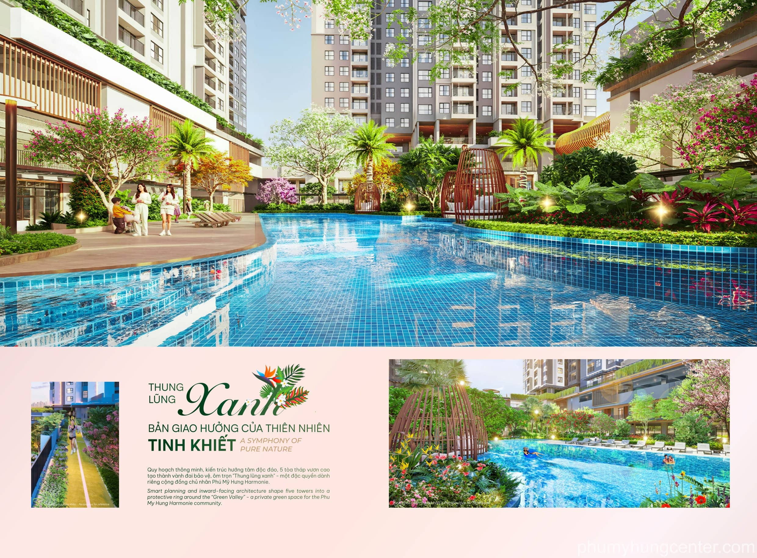 Sinh Thái tuần hoàn: Dự án Harmonie “Kiến tạo thung lũng xanh” biệt lập, các khối tòa nhà căn hộ đóng vai trò là lá chắn, bảo vệ lõi cảnh quan trung tâm khỏi khói bụi, tiếng ồn, tạo nên một miền xanh tĩnh tại.