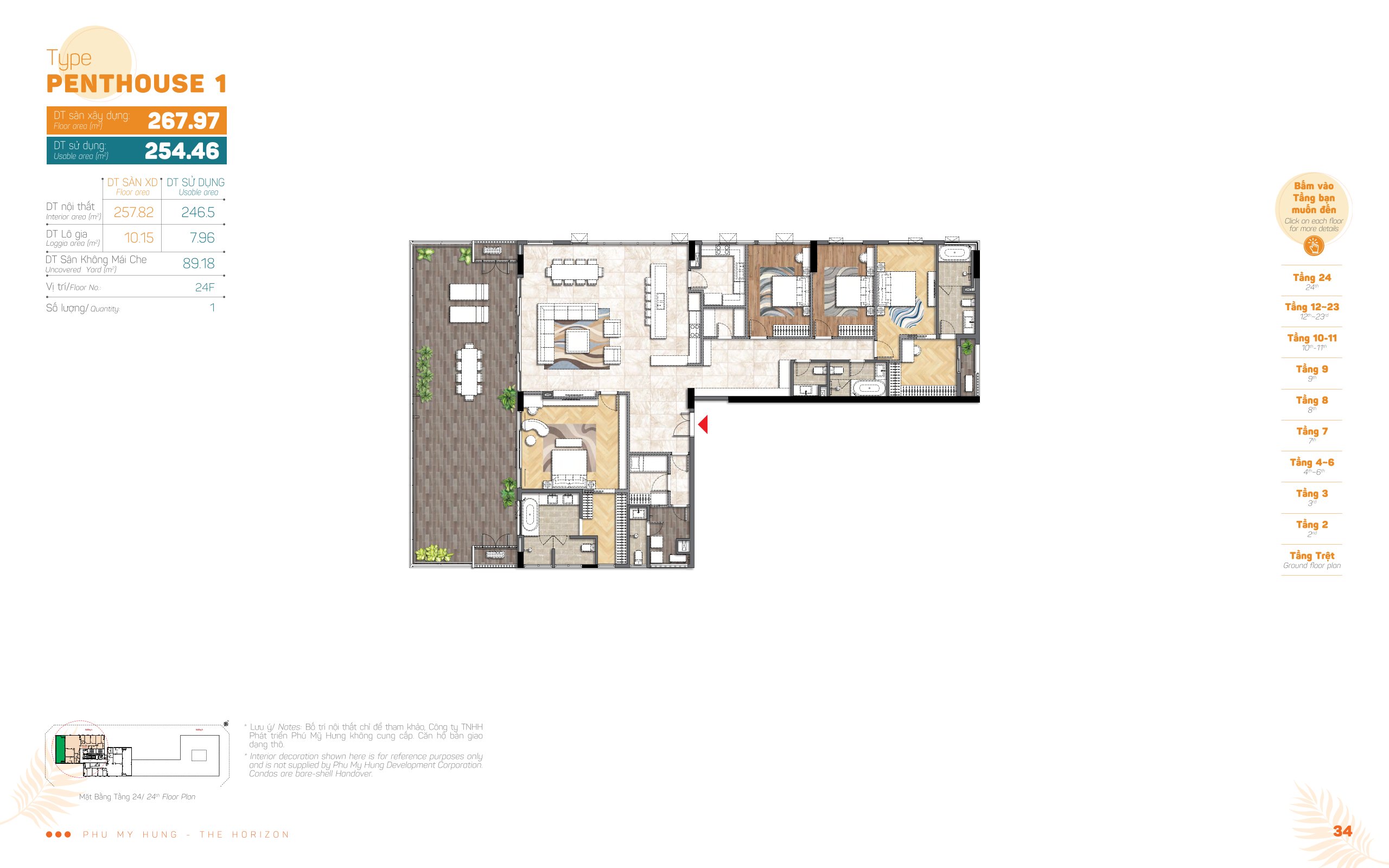 | Loại hình căn hộ (DTXD) | 1PN (53.17m2); 2PN (85.75m2); 3PN (106.72m2 – 166.14m2); 4PN (166.14m2); Penthouse (264.65 – 268m2). Khoảng 90% là căn 3PN trở lên. | |