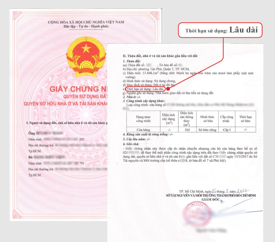 • Thời hạn sở hữu: 50 năm kể từ ngày được cấp Giấy chứng nhận. Sau 50 năm, người sở hữu có thể làm thủ tục xin gia hạn hoặc bán lại.